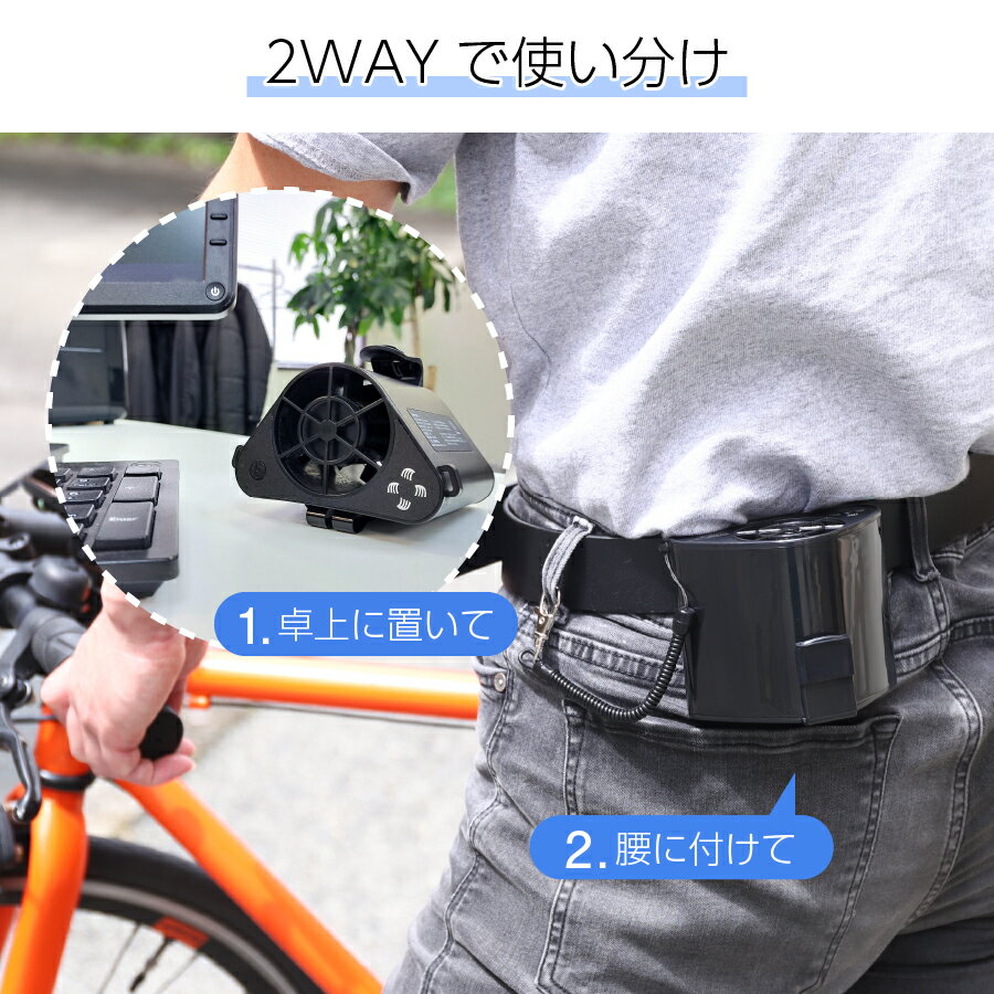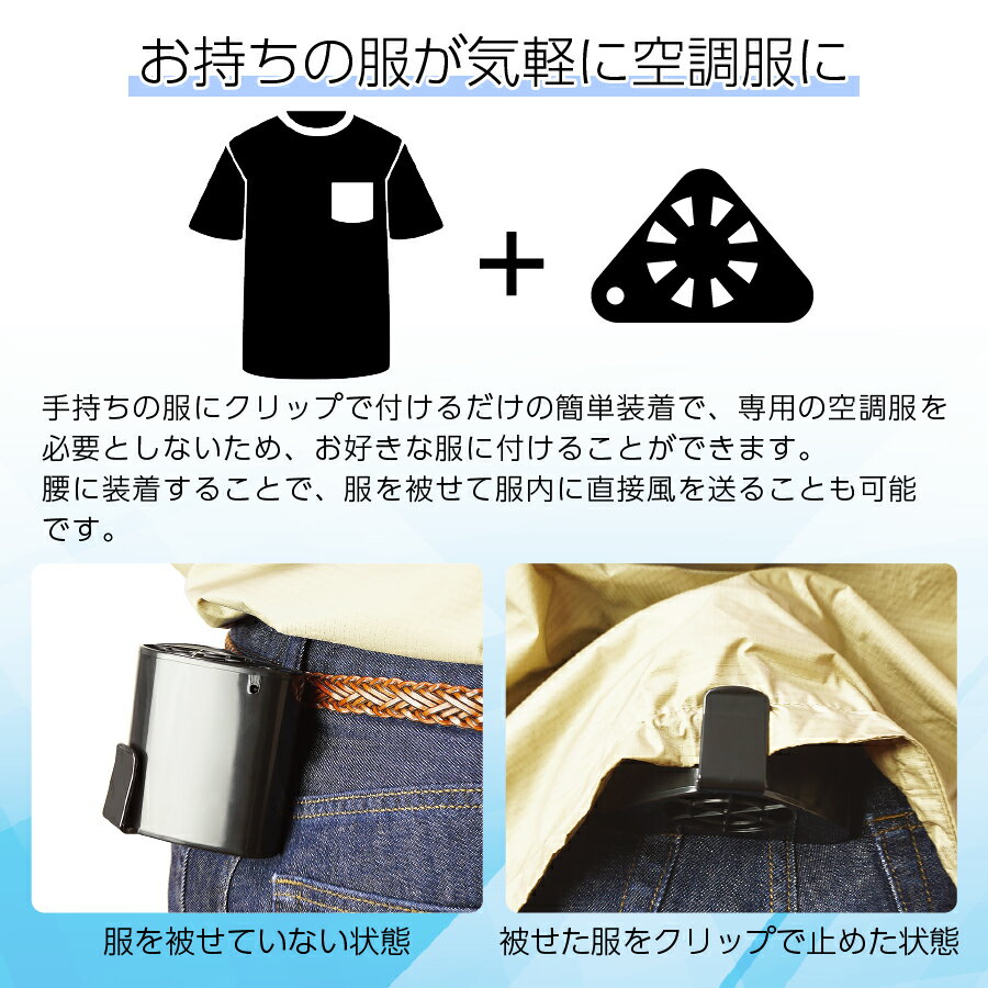 (約500回充放電可能)【推奨シーン】工事現場/工場や倉庫内作業/農作業/ガーデニング/バイク/自転車/厨房/野外イベント/釣り/登山/卓上送風機/炎天下における作業等【使用方法】(1) 製品本体の充電が完了したら、衣服のベルトや安全帯にジェットファン本体のクリップ(大)にはさんで取り付けてください。