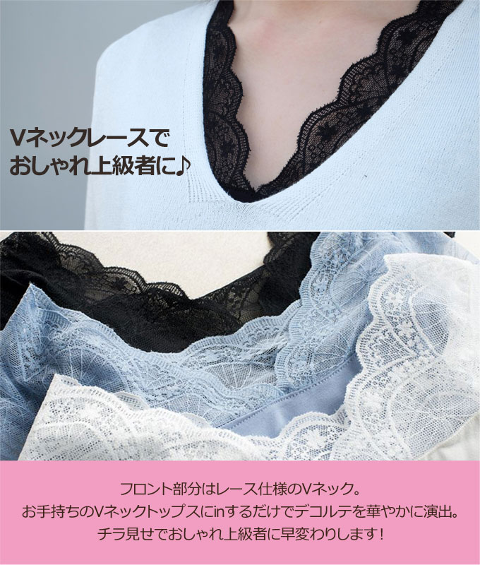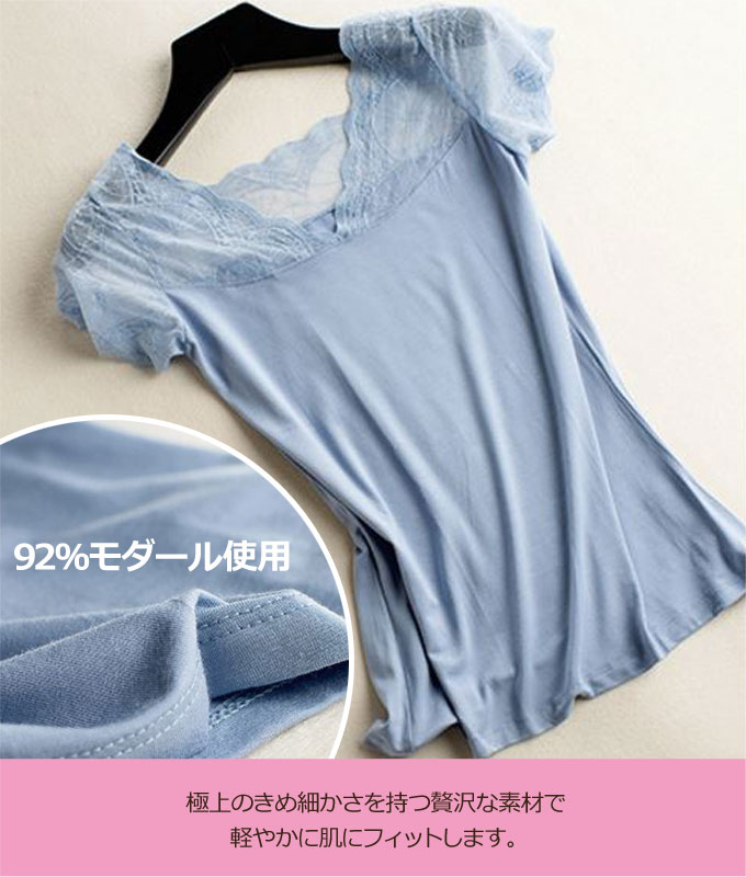 インナー レディース 半袖 【メール便送料無料】 レース トップス 黒 夏用 tシャツ vネック 無地 白 ホワイト フリル 花柄 モダール 2way ブルー 汗 涼感 チラ見せ 伸縮性 ◎ カットソー [cut-056]